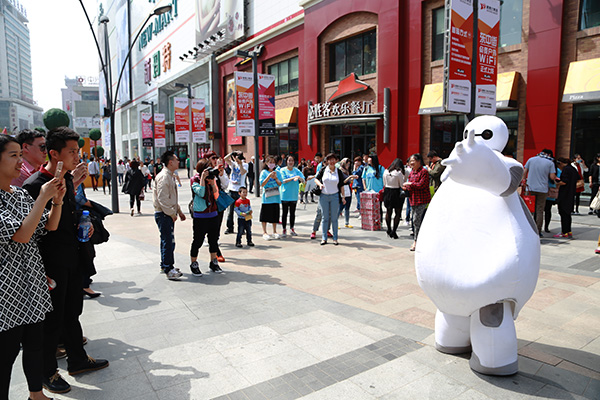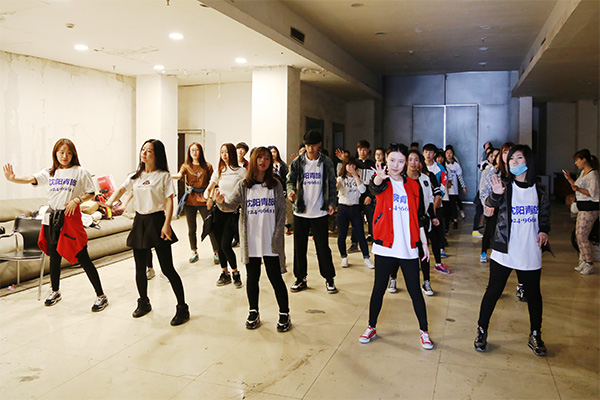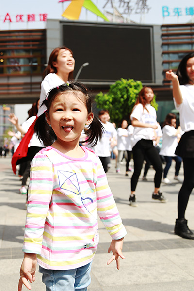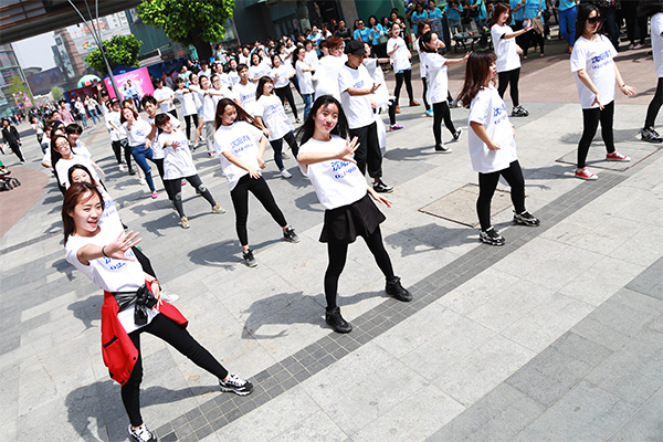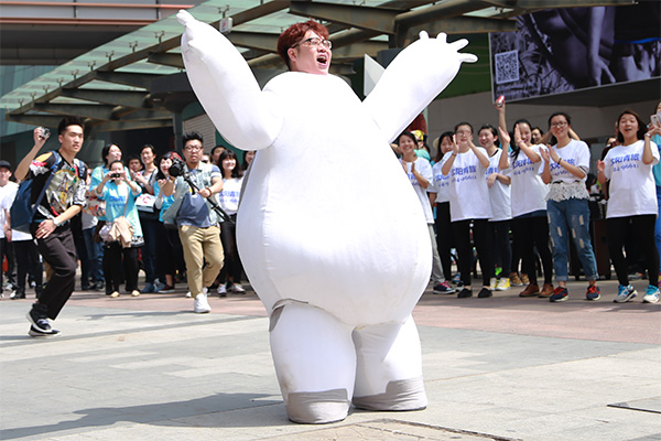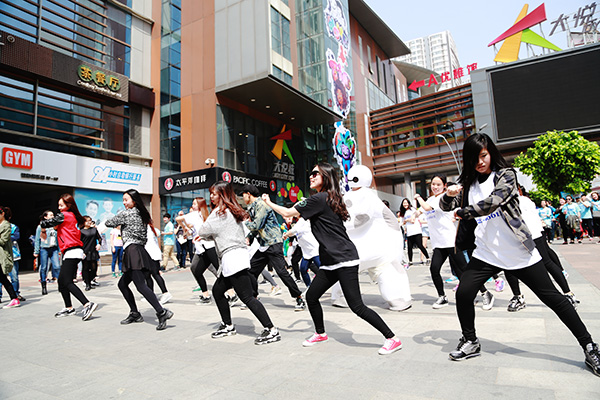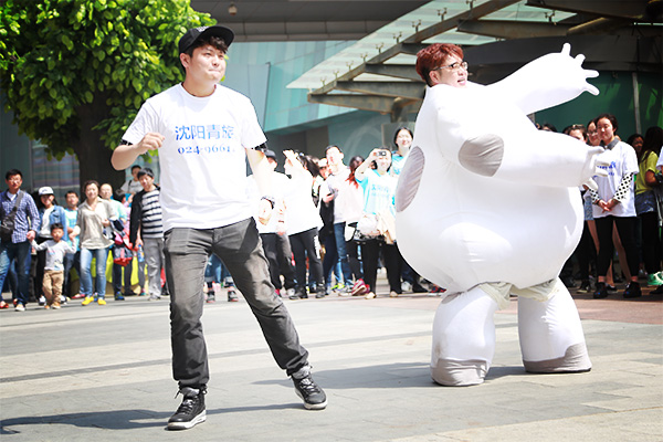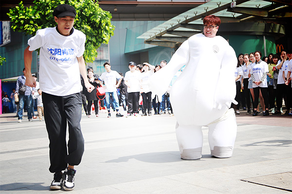 26日下午13:00,沈陽中街大悅城門前廣場像每個周末一樣人頭攢動,人們想平日一樣行走在周末擁擠的街頭。忽然,數十名年輕人從四面八方聚集至此,他們紛紛脫下自己的外套,方才還紛亂的街頭瞬間形成了一個整齊的方陣,同時還有一個可愛的“大白”人偶在方陣中間動感的跳舞,格外惹眼。這時候,人群中想起了音樂,原來是主持人大兵的新神曲《撓撓》,伴著勁爆的音樂,參與快閃的舞蹈演員們精彩的表演著節(jié)目,現場所有行人都不免駐足觀看。這時,大白將頭套摘掉,人群中爆發(fā)出了一陣尖叫——原來一直在人群中走動的“大白”竟然是著名主持人大兵。