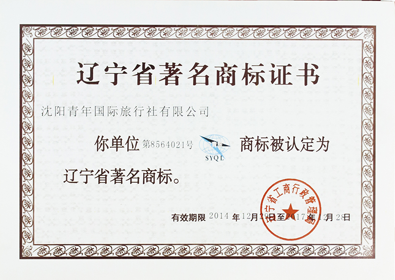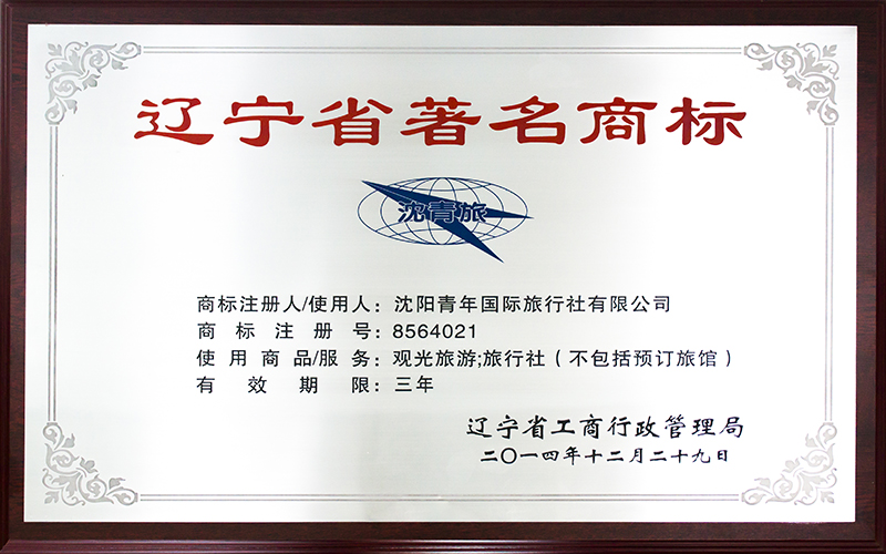 近日,我社成功獲得《遼寧省著名商標證書》,沈陽青年國際旅行社有限公司商標被認定為遼寧省著名商標。